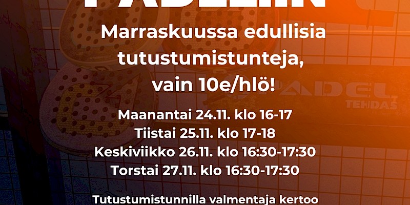 Marraskuussa Black Friday -tarjouksena tutustumistunteja vain 10e/pelaaja! Tervetuloa edullisesti tutustumaan padeliin valmentajan johdolla! Tutustumistunnit: Maanantai 24.11. klo 16-17 … Tiistai…